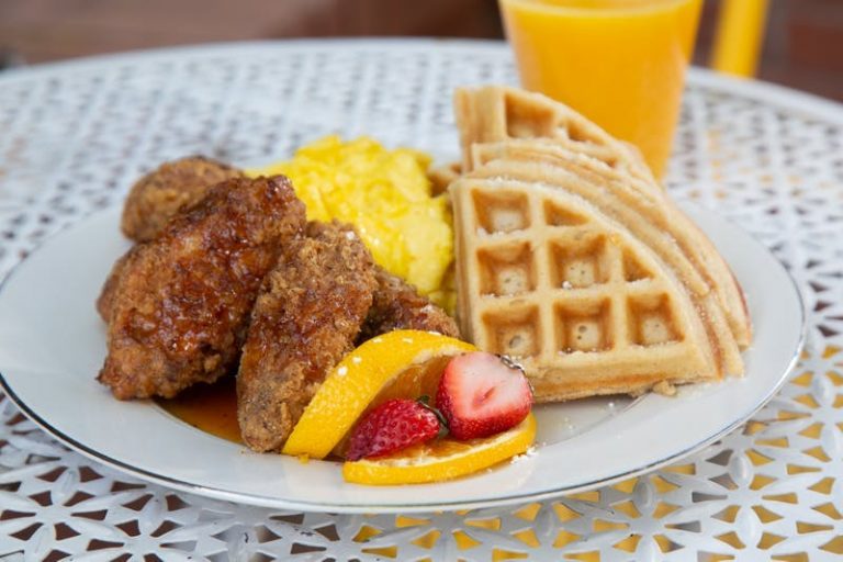 Now on to the savory and scrumptious food. You could have your choice of SAVORY WAFFLE N’ COUNTRY FRIED CHICKEN BREAST with Cheddar N’ Chive Waffle topped with country fried chicken breast ladled with sausage gravy and topped with smoked peppered bacon served with two eggs for $16.25.